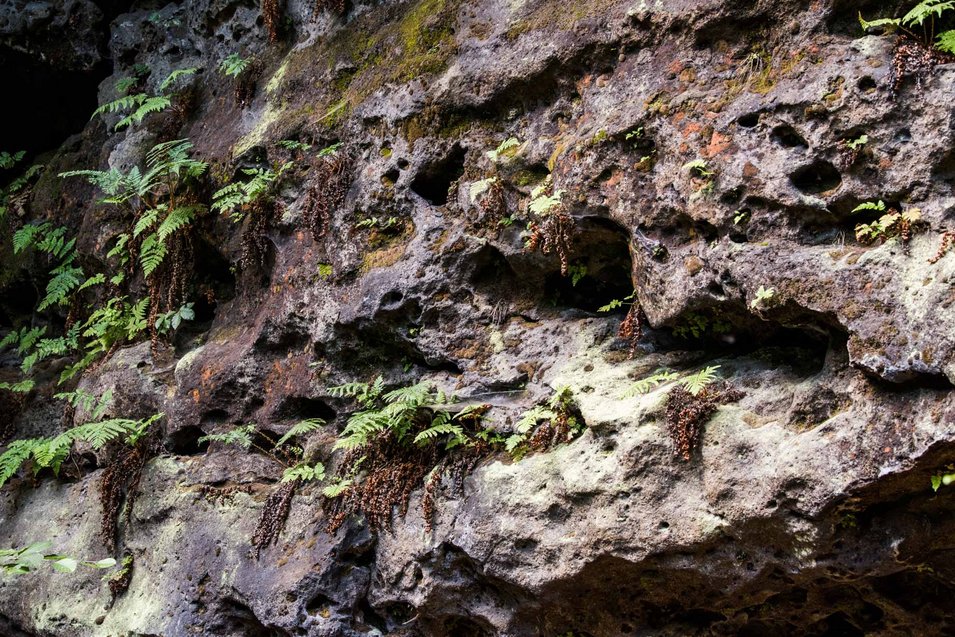 Plötzlich fühlen wir uns ganz klein. Vor uns erhebt sich dieses gewaltige Felsenungetüm. 30 Meter hohe Wände, die noch monumentaler wirken, weil wir sie nur aus der Nähe und der Froschperspektive sehen können. Wie ein riesiges Maul öffnet sich eine horizontale Höhle fast über die gesamte Breite. Verstreut liegende Felsbrocken verleihen der Szene etwas Unheimliches.